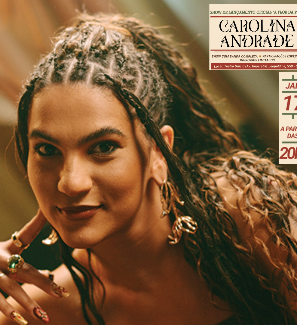 Carolina Andrade apresenta a Turnê “À Flor da Pele” em formato completo no Teatro Unicid, no coração de São Paulo, no dia 17 de janeiro de 2026. A artista santista convida o público para uma experiência sensorial única — onde voz, emoção e presença se fundem em um só corpo.